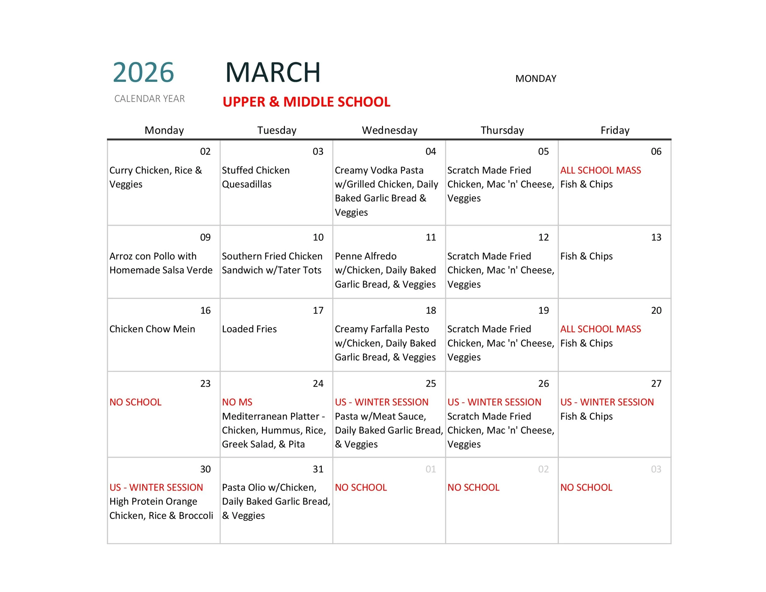 UPPER & MIDDLE SCHOOL MARCH 2026 MEAL CALENDAR LOWER SCHOOL MARCH, 2026 MEAL CALENDAR MIDDLE/UPPER SCHOOL MARCH LUNCH LINK LOWER SCHOOL MARCH LUNCH LINK