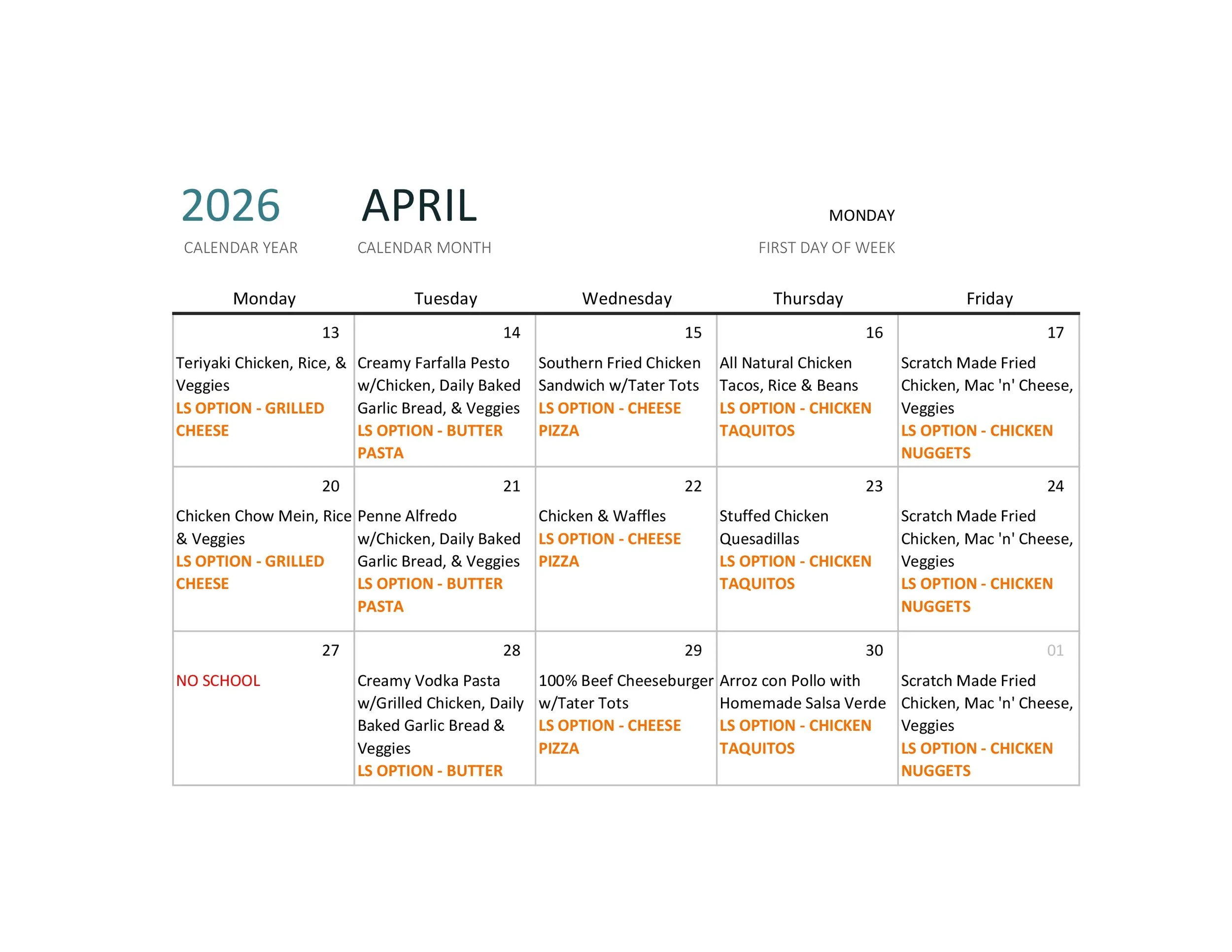 LOWER SCHOOL MARCH, 2026 MEAL CALENDAR